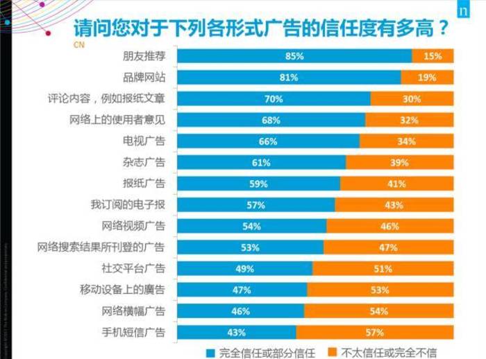 在中国最可信的广告形式直接来源于消费者所了解且信赖的人。超过八成(85%)的中国受访者表示他们对于来自于朋友和家人的推荐完全或者一定程度上信赖。然而信赖不仅限于对那些处在内部人际圈的人。事实上,70%的受访者信赖编辑的内容如报纸文章。同时超过三分之二(68%)的受访者反映他们相信消费者发布在网络中的观点。上述两种形式分别是在值得信赖的广告媒介中排名分别为第三和第四。