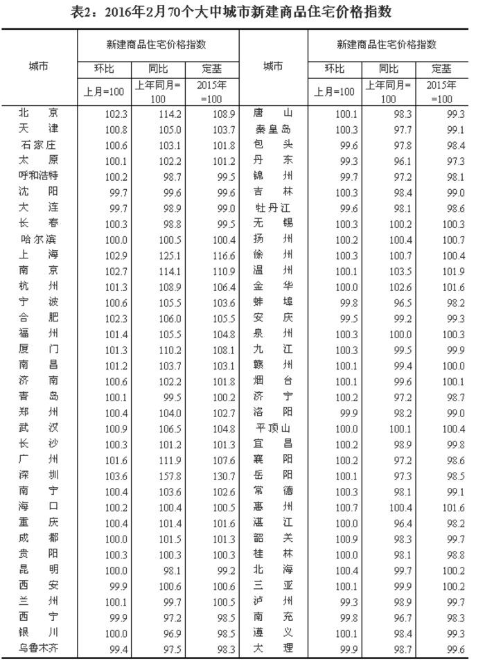 一、房价环比上涨城市个数增加,涨幅继续扩大。尽管2月份适逢春节假期,绝大部分城市成交量有明显下降,但全国70个大中城市房价涨幅较上月仍有所扩大,且上涨的城市个数有所增加。发布的数据显示,2月份70个大中城市新建商品住宅价格环比上涨的城市有47个,比1月份增加9个;环比上涨的城市里,涨幅比上月扩大的城市有33个,比1月份增加10个;涨幅在1%以上的城市有10个,比1月份增加3个。分城市看,2月份一、二、三线城市新建商品住宅价格环比平均都上涨,且涨幅分别比上月扩大0.5、0.1和0.1个百分点。城市间房价涨幅差距进一步加大,一线城市和个别热点二线城市涨幅远高于其他城市,分化现象持续。
