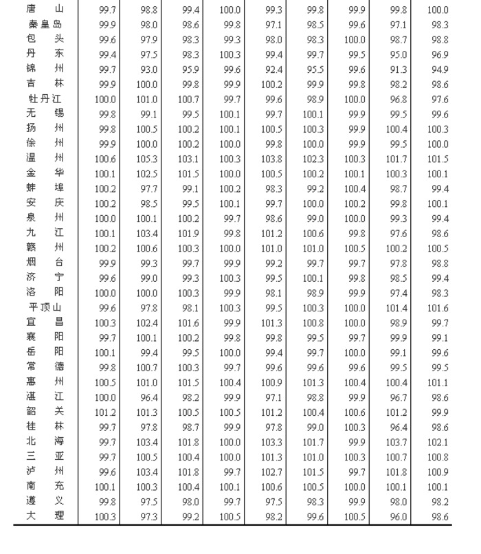 (一)与上月相比,70个大中城市中,价格下降的城市有28个,上涨的城市有34个,持平的城市有8个。环比价格变动中,最高涨幅为6.7%,最低为下降1.1%。