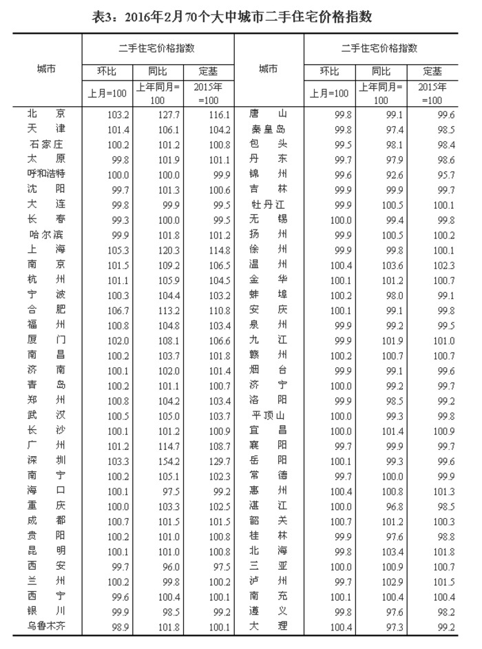 (二)与上年同月相比,70个大中城市中,价格下降的城市有26个,上涨的城市有41个,持平的城市有3个。2月份,同比价格变动中,最高涨幅为54.2%,最低为下降7.4%。