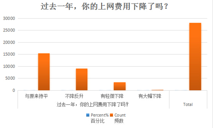 通过调查,新华网发现有两个“感觉不明显”。一是用户对费用下降感觉不明显,二是用户对速度提高感觉不明显。其中,上网资费方面,调查显示,“提速降费”一周年,的确有不少用户表示实实在在地感受到上网费用下降,但也有一半以上的人表示“和原来差不多”,还有近三成的人觉得“费用不降反升”。