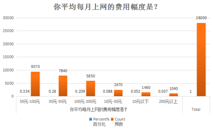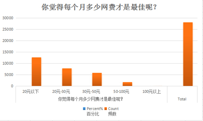 调查显示,对于目前的上网费用,近六成的网民认为“较贵”,而认为“非常贵”的人并不是很多。目前,33%的受调查者月费用在50元-100元之间,30元-50元的近三成,100元-200元的占两成,极少数人月费用能达到200元以上。对于理想的上网费用,四成网民认为20元以下比较合适,约一半的网民认为20-50元是合理区间,接受50元以上的人不足10%。