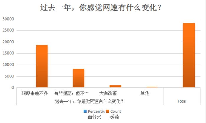 对于网速,调查显示,有近三成的网民认为“网速有所提高”,有六成以上的网民认为“跟过去差不多”。可以看出,用户对网速提高的感受,比对费用下降的感受要明显,但总体上“感觉不明显”的人也还是很多。这一方面是因为,网速到底快不快,不仅和运营商提供的服务有关,和终端设备尤其是移动设备能不能支撑也有很大关系。另一方面,就去年来说,网速已经比以前快不少,所以进一步的提升能有多明显,这个不能靠感觉来说话。但如果跟几年前对比的话,变化还是非常明显的。