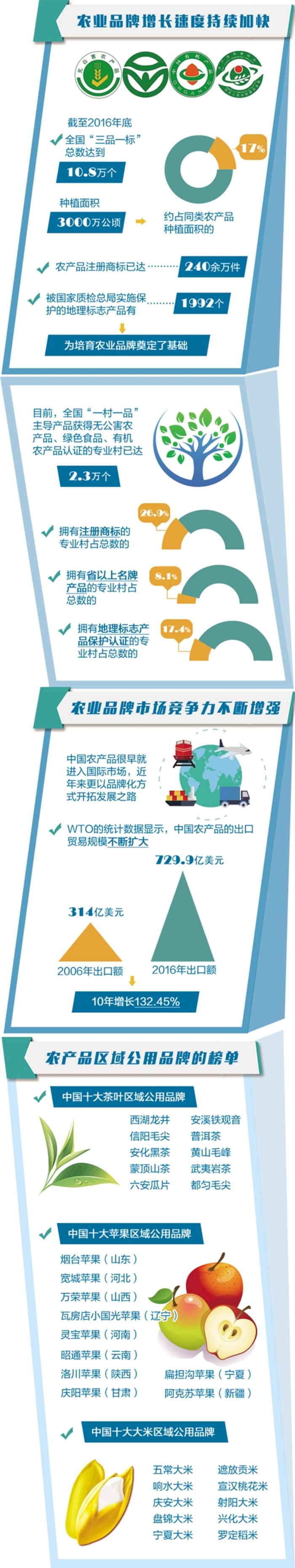 在区域公用品牌建设渐趋成熟的同时,农业企业品牌建设力度也不断提升,注册商标的积极性日益高涨。统计显示,截至2016年底,全国“三品一标”总数达到10.8万个,种植面积3000万公顷,约占同类农产品种植面积的17%;农产品注册商标已达240余万件;国家质检总局已对1992个地理标志产品实施保护,为培育农业品牌奠定了基础。在此基础上,种养大户、家庭农场、农民合作社等新型农业主体蓬勃兴起,更为农业品牌增添发展新动能。