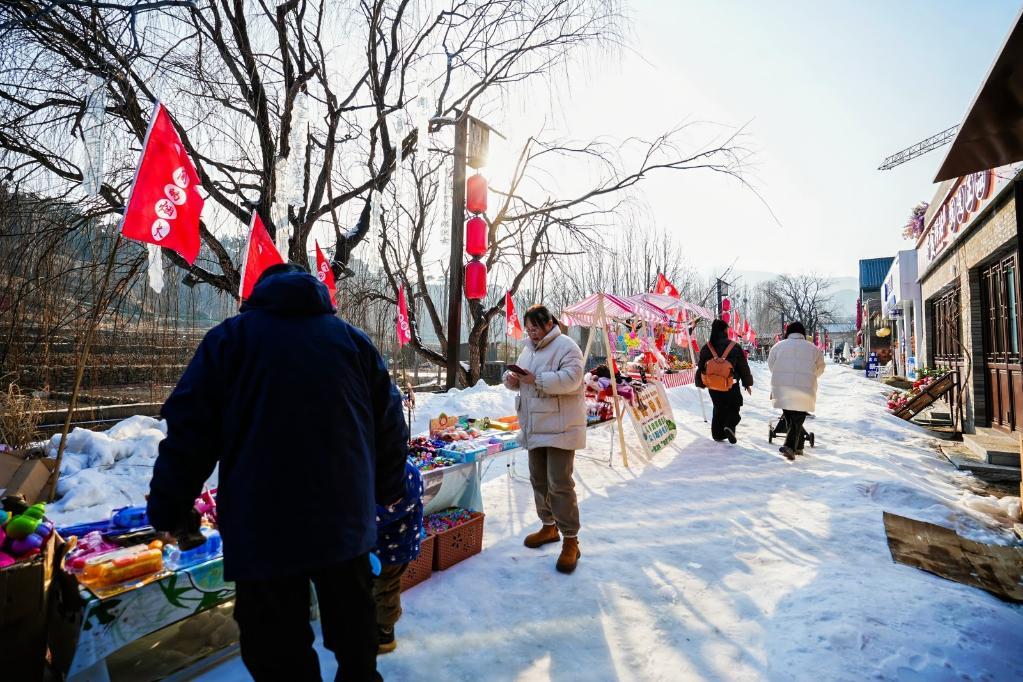 游客在济南莱芜区雪野街道王老村体验冰雪趣味项目