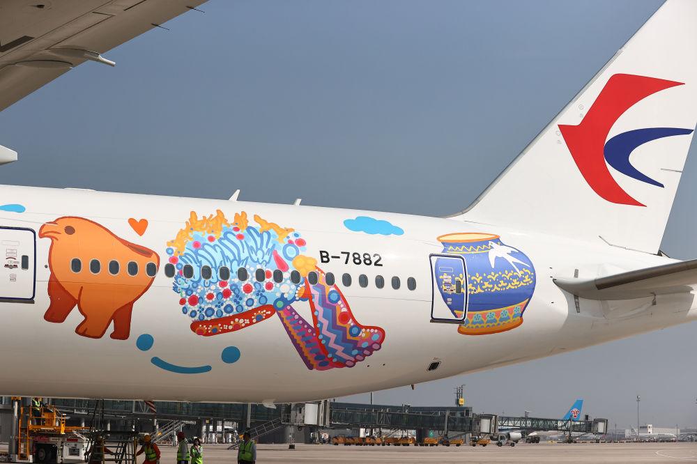 2025年9月28日在北京大兴国际机场拍摄的“国博号”彩绘主题飞机。新华社发(卢旭摄)