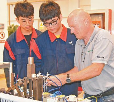 德国技术人员为苏州健雄职业技术学院学生培训操作技能。