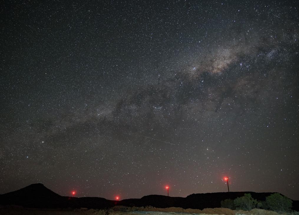 2025年10月22日,在南非北开普省德阿镇,德阿风电项目的风机在星空下运转。新华社记者韩旭摄