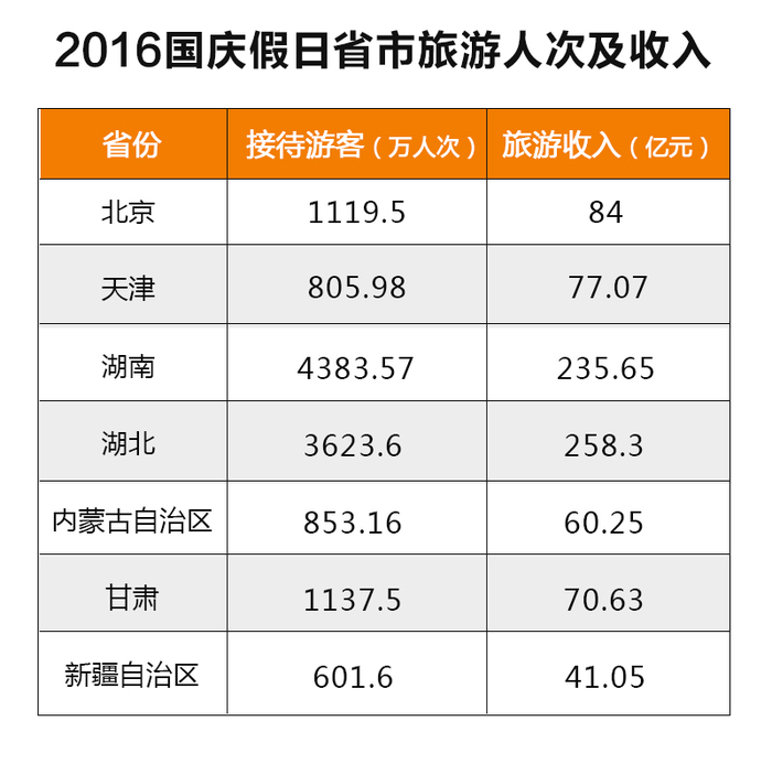 假日期间,北京、天津、海南等传统国庆长线旅游目的地旅游接待人次和收入稳步提升。北京市10月1日至7日共接待游客1119.5万人次,同比下降2.8%,旅游总收入84亿元,同比增长1.1%;天津市10月1日至7日共接待游客805.98万人次,同比增长5.5%,旅游总收入77.07亿元,同比增长12.8%。海南省10月1日至7日进港54.4万人,同比增长23.23%,进港车辆3.56万辆,同比增长43.03%。湖北、湖南等中部省份天气较好,适宜游客出行,旅游接待人次和收入增长较快。湖北省10月1日至7日共接待游客3623.6万人次,同比增长20.1%,旅游总收入258.3亿元,同比增长22.3%;湖南省10月1日至7日共接待游客4383.57万人次,同比增长16.51%,旅游总收入235.65亿元,同比增长16.89%。