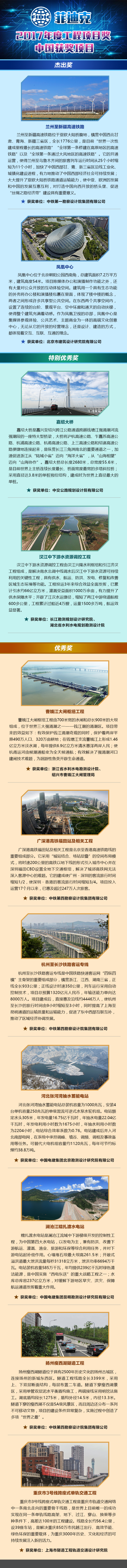 今年10月1日—3日,菲迪克年会在印尼雅加达召开,在21个获奖项目中,中国占了11个:兰州至新疆高速铁路、凤凰中心荣获杰出奖;嘉绍大桥和汉江中下游水资源调控工程项目荣获特别优秀奖;广深港高铁福田站及相关工程、杭州至长沙铁路客运专线项目、澜沧江糯扎渡水电站项目等7个项目荣获优秀奖。我国获奖总数连续五年第一。