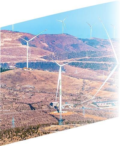 河南省洛阳市嵩县九皋镇风电场,一排排风力发电机组迎风转动,源源不断输送绿色电力能源。