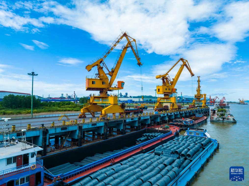 在方大集团九江萍钢钢铁有限公司位于长江边的码头,塔吊在装卸货物(2025年7月20日摄)。新华社发(张玉摄)