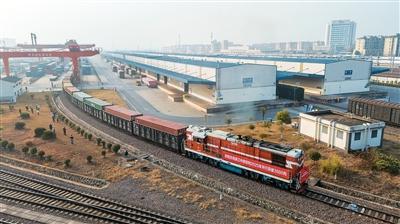 浙江省金华市金东区华东国际联运港,一列满载一百标箱的中欧班列经海关监管后从金华南站鸣笛启程,奔赴中亚五国。